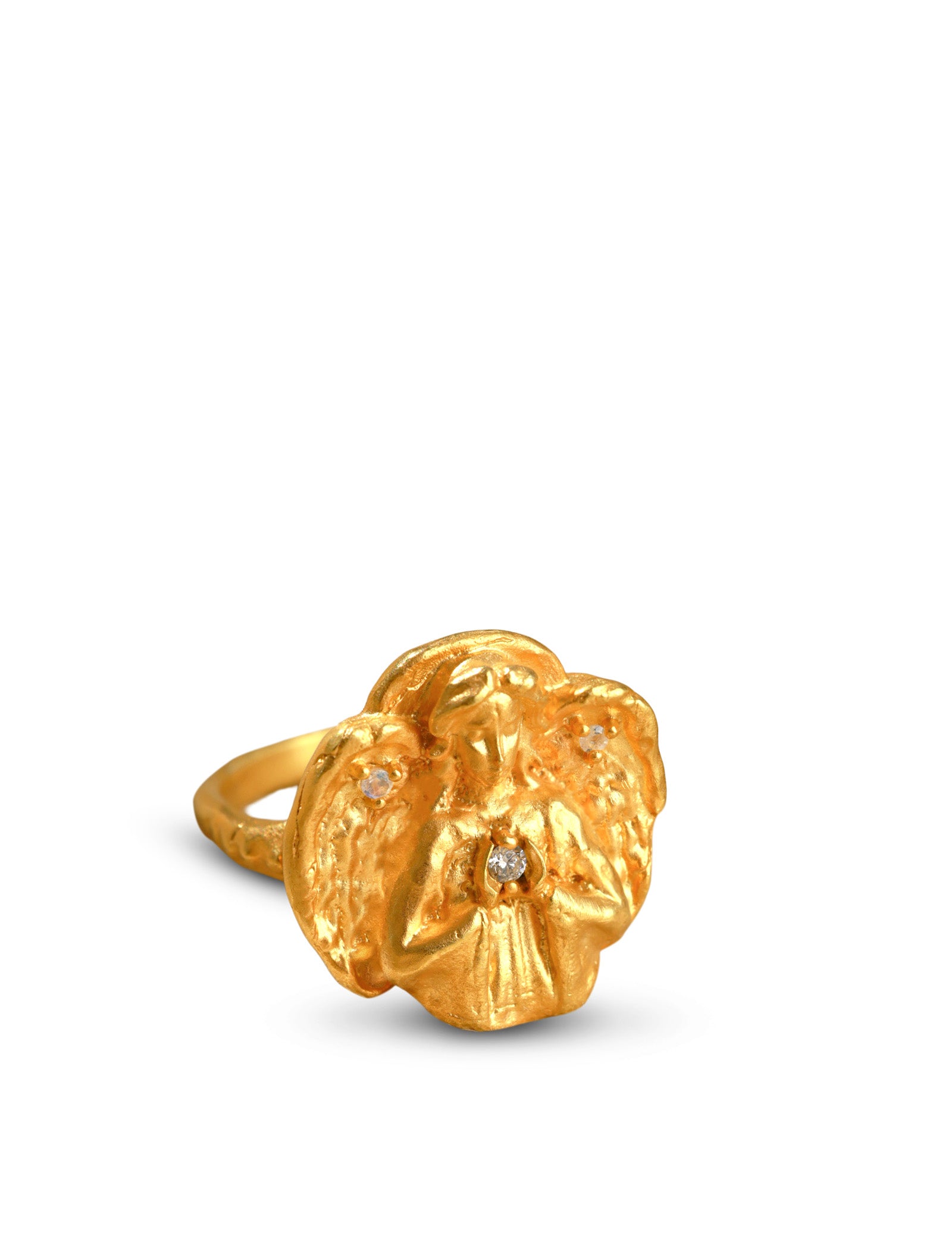 Feel the power of divine guidance with this stunning gold-plated silver ring. It features a beautiful angel design, holding one sparkling diamond.