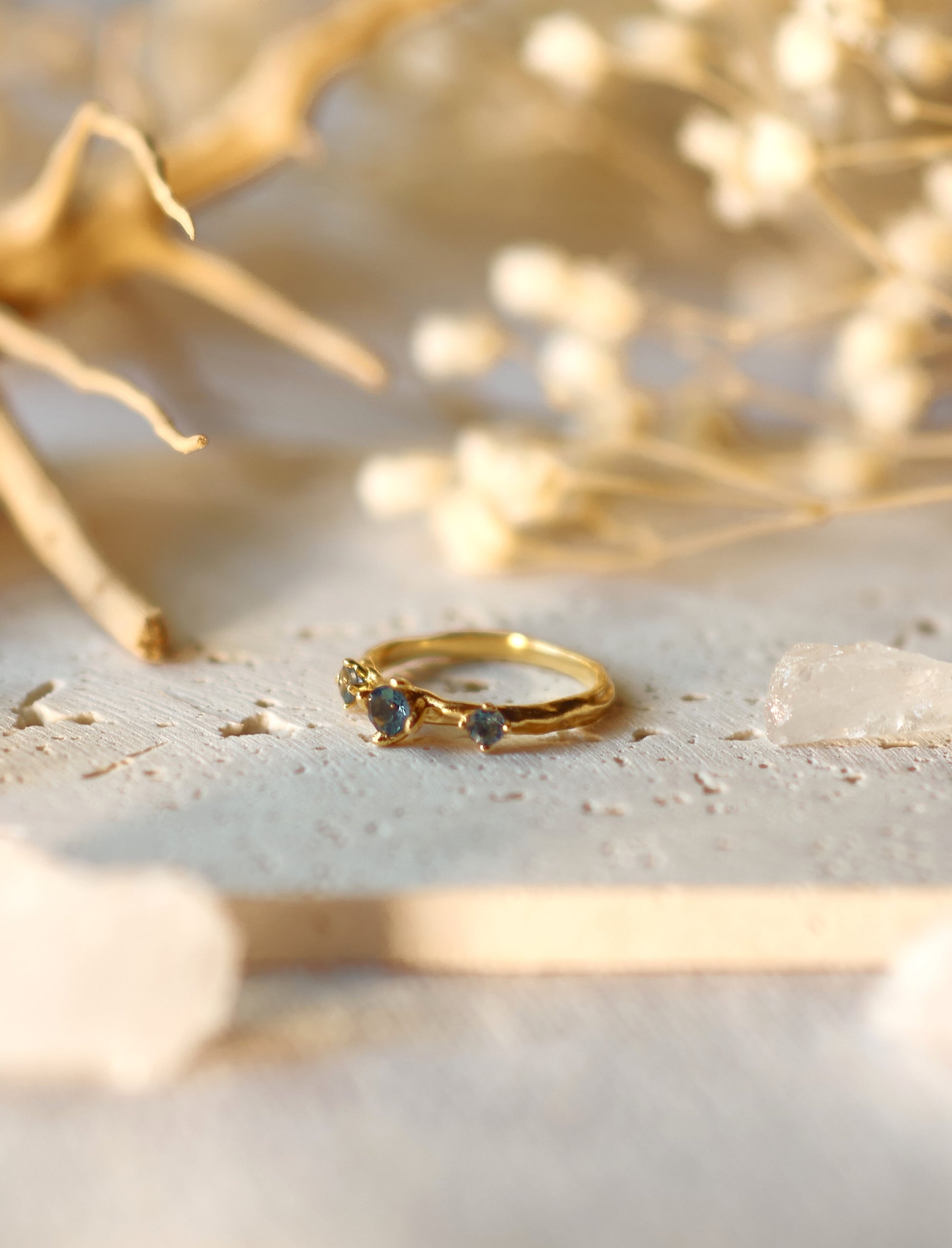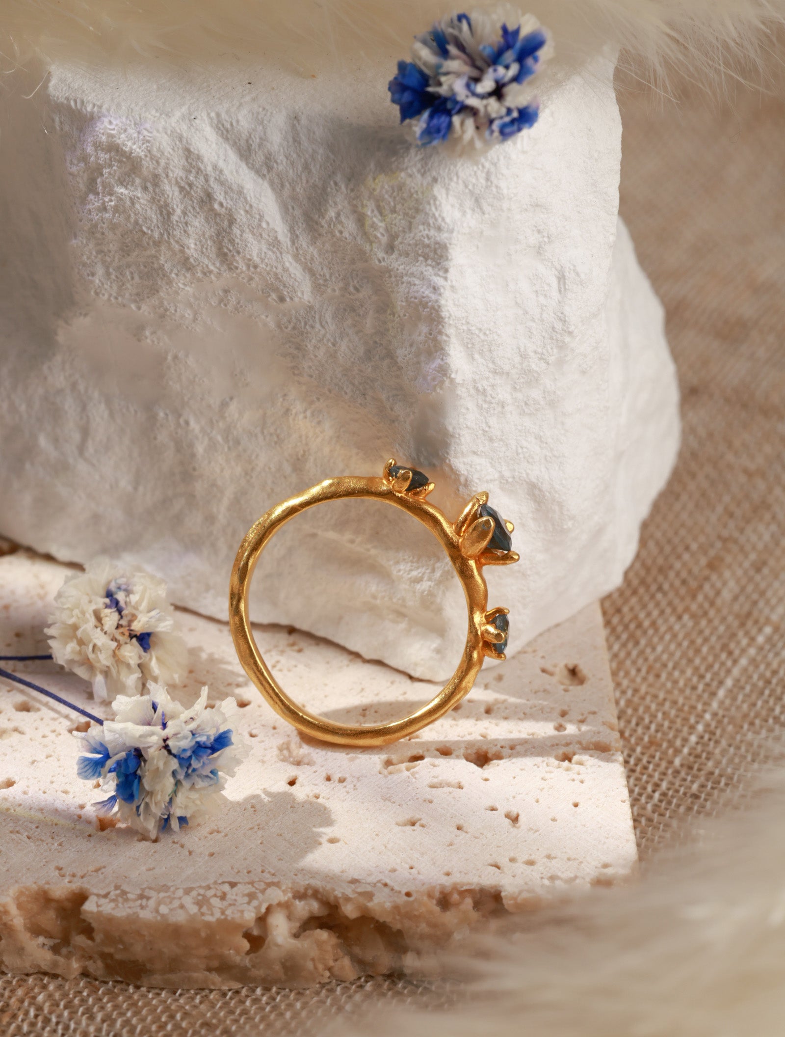 Discover a piece of profound beauty and powerful energy with this exquisite gilded silver ring, adorned with three captivating London Blue Topaz gemstones. More than just an ornament, this ring is a conduit for ancient wisdom and profound tranquility.