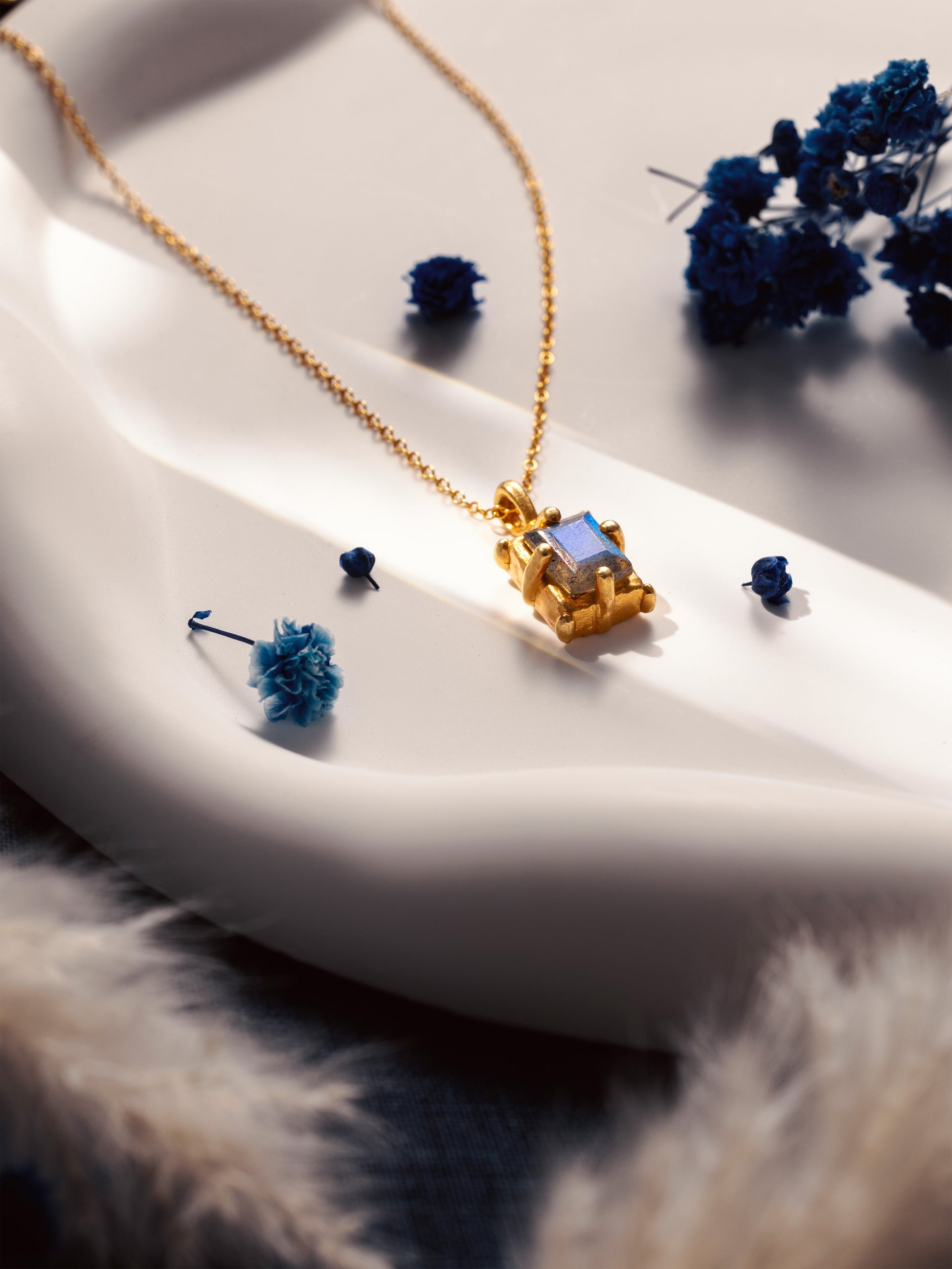 Feel the magic with this beautiful gold-plated silver necklace. It has a simple, rectangular shape and a mesmerizing labradorite stone.
